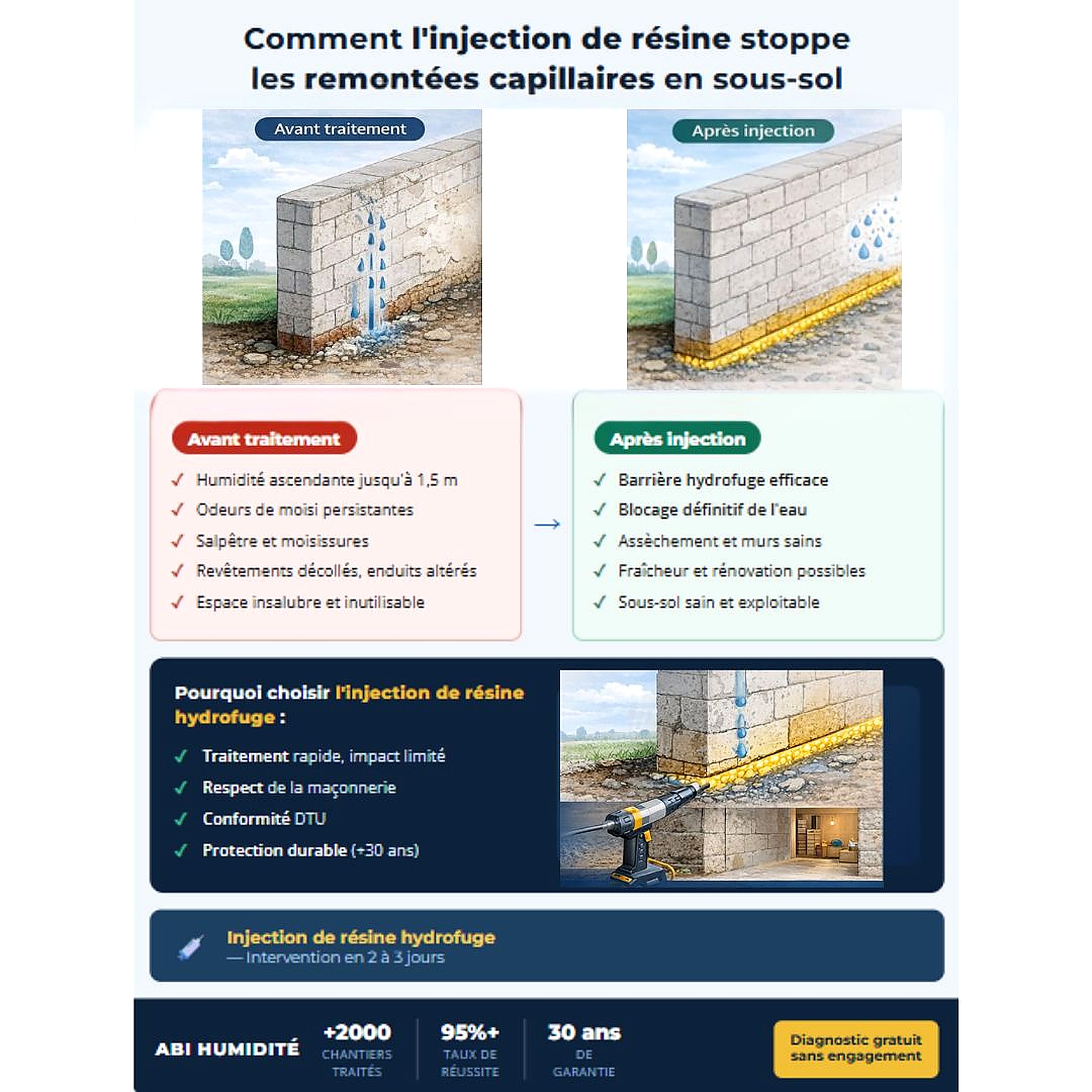 ABI Humidité dispose des certifications professionnelles et de l'expérience terrain nécessaires pour garantir un résultat optimal. Nos équipes ont traité plus de 2000 chantiers en France avec un taux de réussite supérieur à 95%. Nous utilisons exclusivement des résines de qualité professionnelle, sélectionnées en fonction des caractéristiques précises de votre maçonnerie.